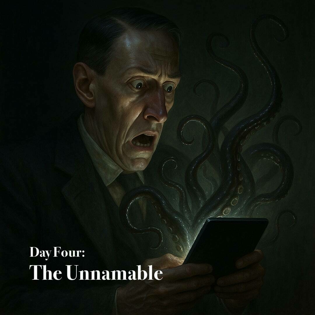 As I prepare myself for this descent into the unknown, I turn to a tale of H. P. Lovecraft’s devising, “The Unnamable.” In this story, Randolph Carter and his companion Joel Manton linger in a graveyard beside a ruined house upon Arkham’s Meadow Hill. Carter recounts whispers of an entity beyond the compass of mortal senses, a terror unfit for any earthly name. Their discourse is shattered when the abomination itself emerges, rending flesh and mind alike. They awake within St. Mary’s hospital, marked with wounds like horns and bruises like hooves. Manton, once unbelieving, can speak only of slime and vapor, of eyes and blemishes, of a thousand shifting forms. At last he names it in trembling tones, calling it what it had ever been: the unnamable.