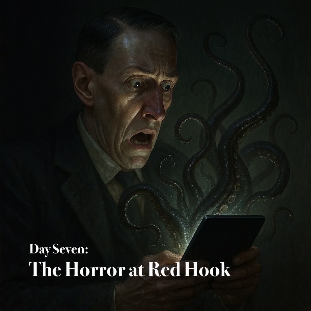A wiser soul than mine would long since have sought the refuge of slumber, yet here I linger, fingers trembling at my keyboard beneath the wan radiance of a swollen harvest moon. Through my window its argent light spills—cold, pitiless, eternal—illuminating the pages of that most noxious of narratives, “The Horror at Red Hook.” A saner man would not summon such phantoms before surrendering to dreams, for sleep is the kingdom of their dominion. Yet folly, ever my companion, bids me read on.