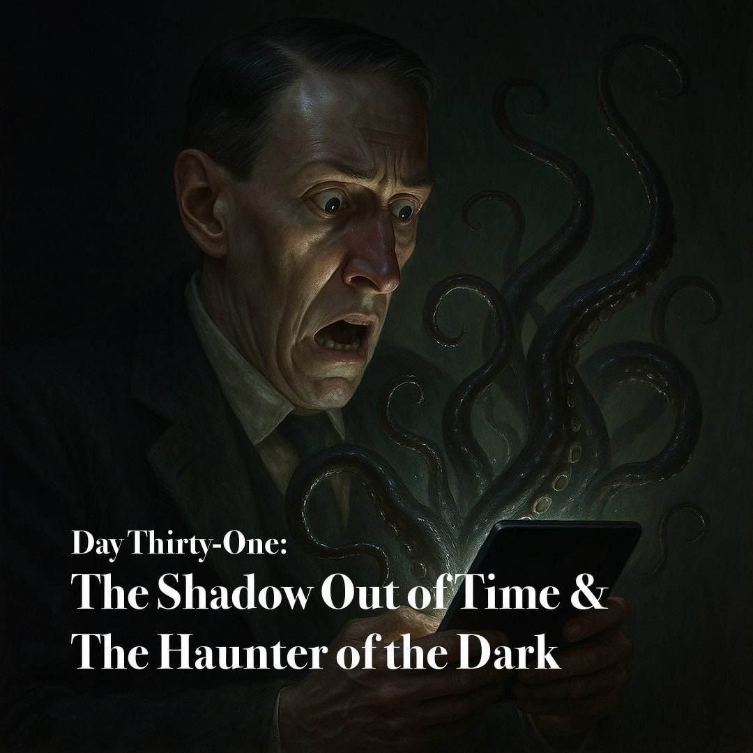 Thus we arrive at the present hour, when the final offerings awaited me: The Shadow Out of Time—that chronicle of mind-shattering temporal exile—and “The Haunter of the Dark”, wherein the abyss itself peers back with light-devouring eyes. Two tales, aye, lest one be banished to the limbo of next October, and so I vowed to complete the cycle upon Halloween itself, an alignment too perfect to resist.